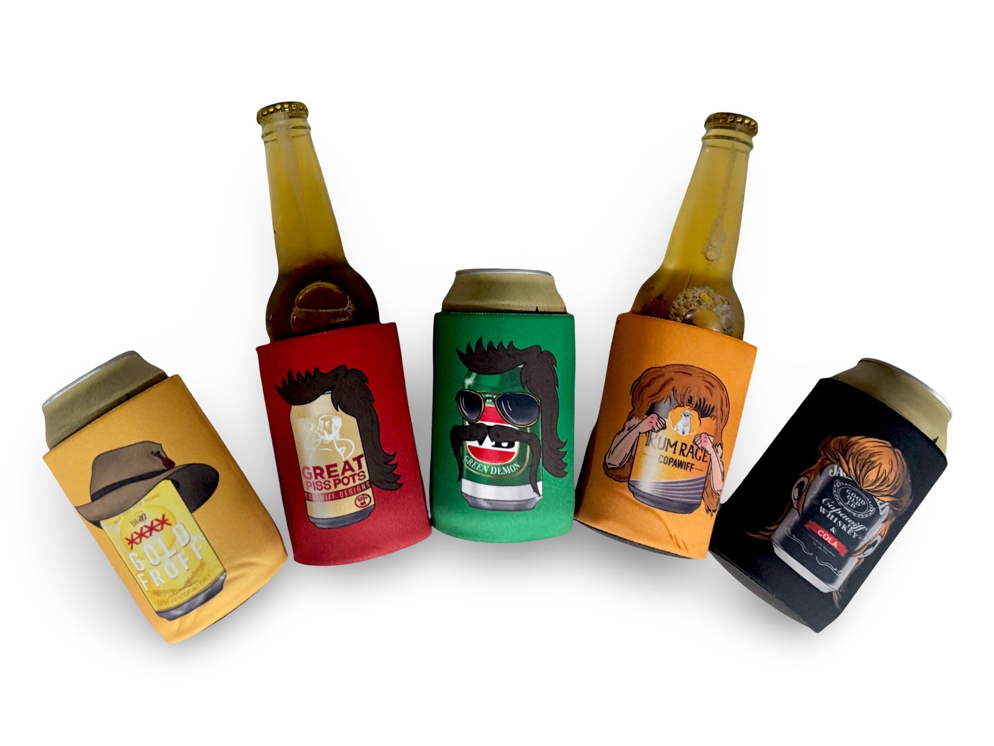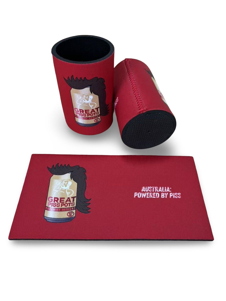 🔥 Five iconic designs – Featuring mullets, mos, mad dog energy, and full piss-powered vibes